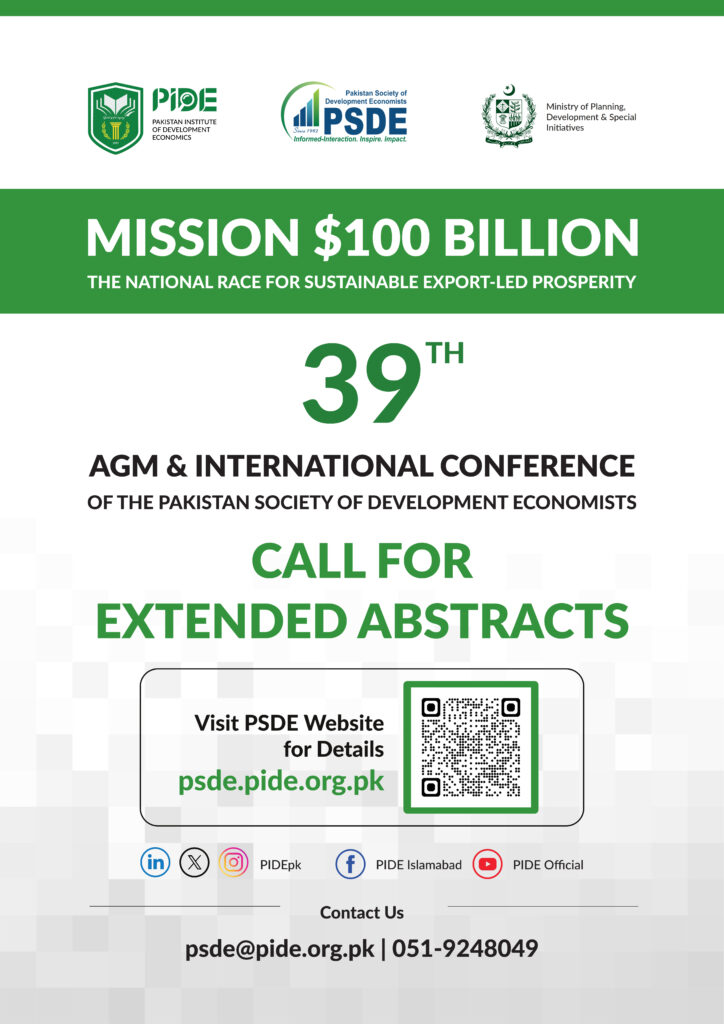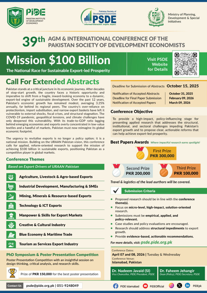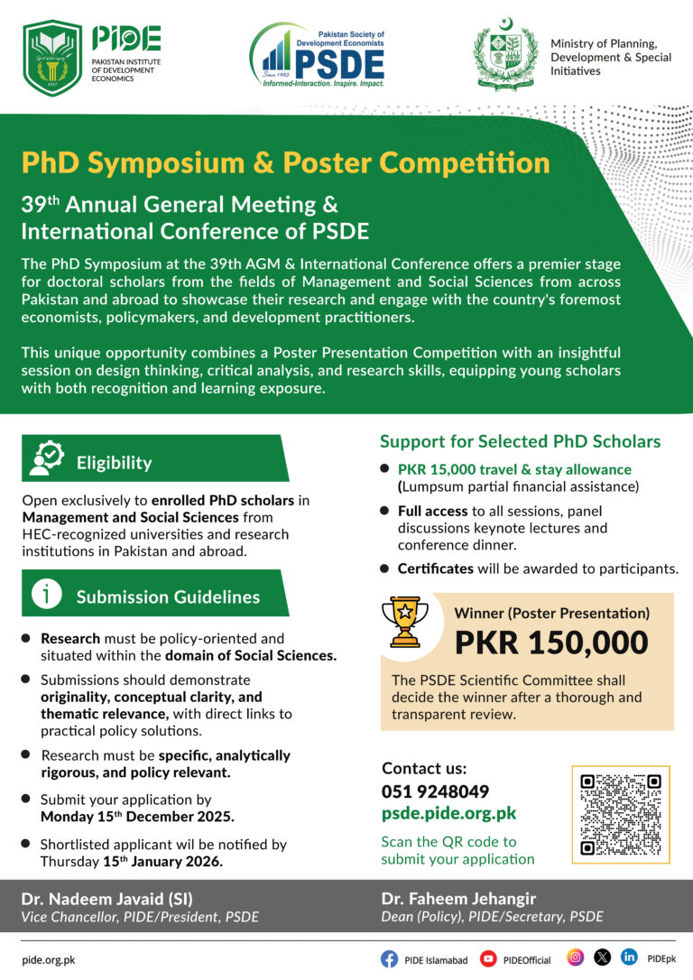 The Pakistan Society of Development Economists (PSDE), in collaboration with the Pakistan Institute of Development Economics (PIDE), invites submissions for the PhD Symposium and Poster Presentation Competition to be held during the 39th Annual General Meeting and International Conference. This symposium provides enrolled PhD candidates with an opportunity to present their research, engage with experts, and compete for recognition and awards.