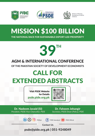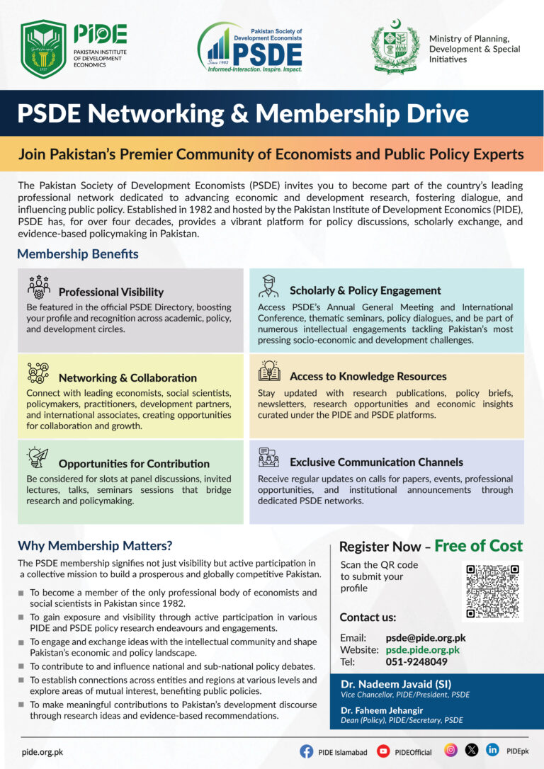 The Pakistan Society of Development Economists (PSDE) invites you to become part of the country’s leading professional network dedicated to advancing economic and development research, fostering dialogue, and influencing public policy. Established in 1982 and hosted by the Pakistan Institute of Development Economics (PIDE), PSDE has, for over four decades, provided a vibrant platform for policy discussions, scholarly exchange, and evidence-based policymaking in Pakistan.
